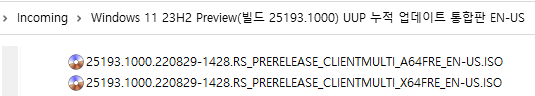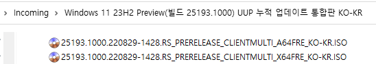 아래 파일은 UUP dump에서 배포하는 스크립트를 이용해서 MS에서 배포하는 파일(ESD, cab파일)로 만든 순수 ISO 파일입니다.