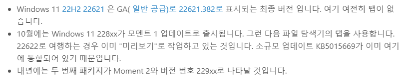 - Moment1은 11월에 첫 번째 업데이트로 출시되었습니다. 탭 등이 추가되었습니다. 이러한 새로운 기능은 22621에 통합되었습니다. (이러한 기능은 22622로 사전 테스트되었습니다).