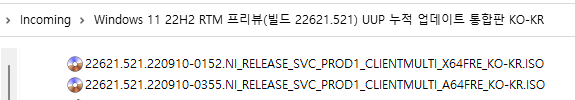 아래 파일은 UUP dump에서 배포하는 스크립트를 이용해서 MS에서 배포하는 파일(ESD, cab파일)로 만든 순수 ISO 파일입니다.