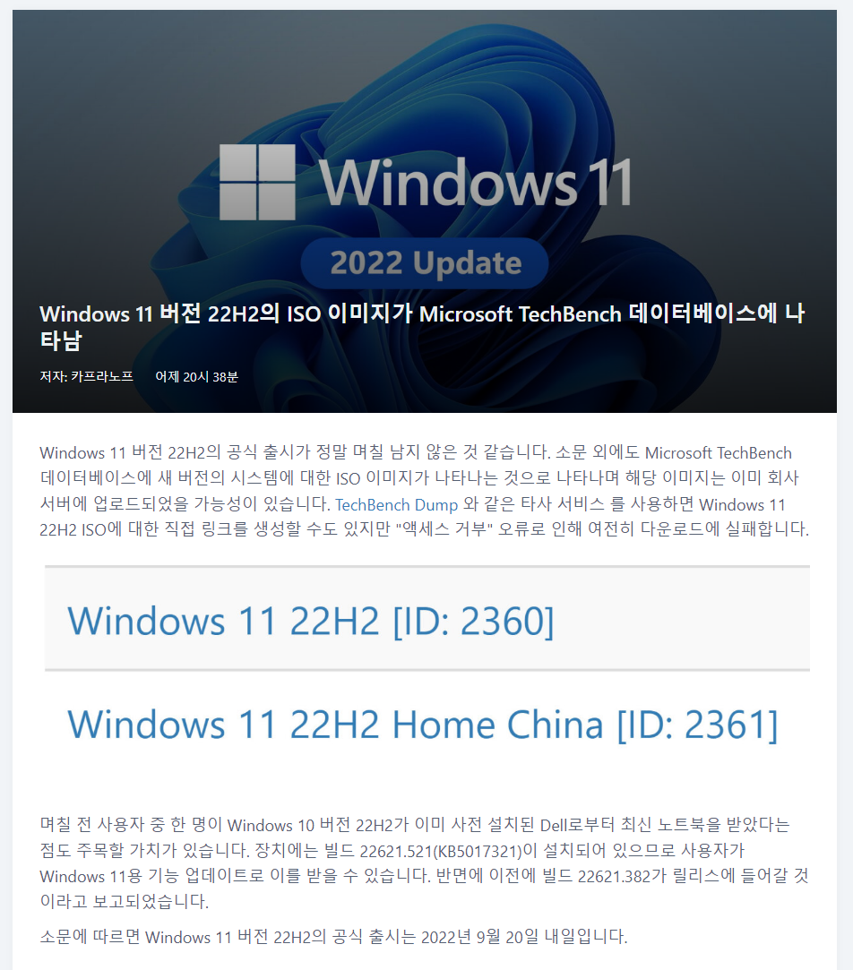 벌써 MS 서버에 22H2의 ISO 이미지에 대한 링크가 올라왔다고 합니다.