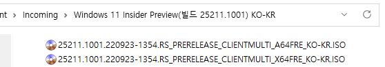 아래 파일은 UUP dump에서 배포하는 스크립트를 이용해서 MS에서 배포하는 파일(ESD, cab파일)로 만든 순수 ISO 파일입니다.