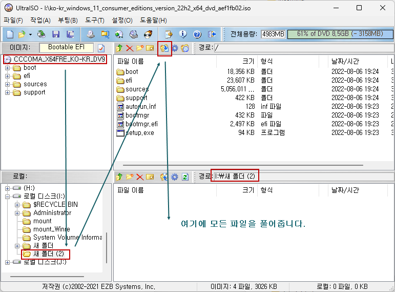 1) UltraISO 프로그램으로 ISO 파일을 열어서 임의의 폴더에 파일들을 모두 풀어줍니다.