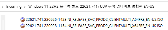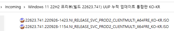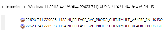 아래 파일은 UUP dump에서 배포하는 스크립트를 이용해서 MS에서 배포하는 파일(ESD, cab파일)로 만든 순수 ISO 파일입니다.