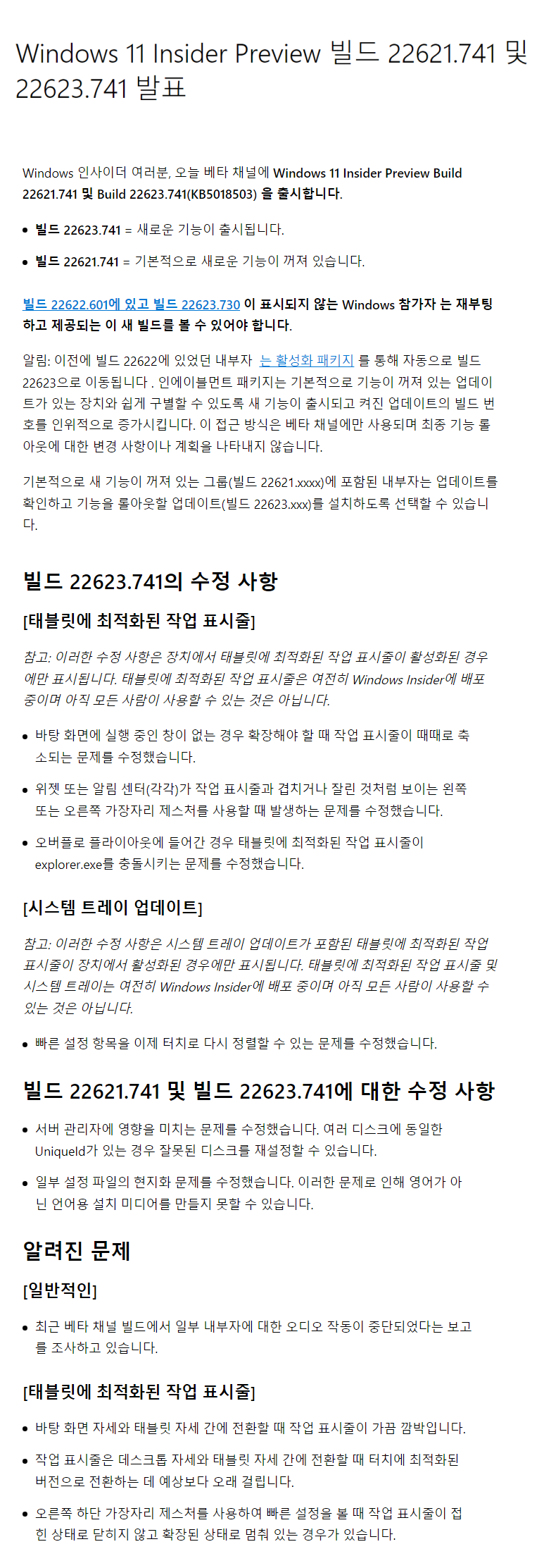 ○ 베타 채널 [Beta] = Windows 11 : 빌드 22621.741 / 22623.741 (= 참가자 빌드)
