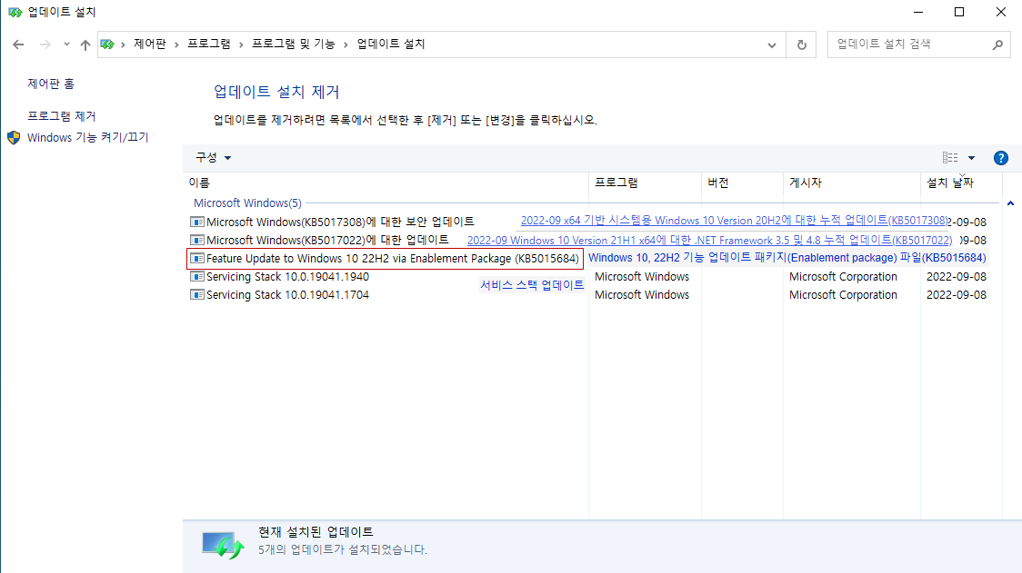 MS에서.... 19041 빌드에 기능업데이트 패키지만 설치해서 19045로 만든 모습