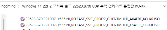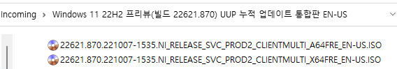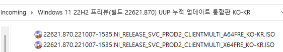 아래 파일은 UUP dump에서 배포하는 스크립트를 이용해서 MS에서 배포하는 파일(ESD, cab파일)로 만든 순수 ISO 파일입니다.
