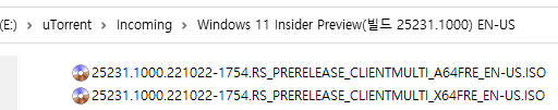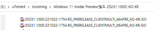 아래 파일은 UUP dump에서 배포하는 스크립트를 이용해서 MS에서 배포하는 파일(ESD, cab파일)로 만든 순수 ISO 파일입니다.