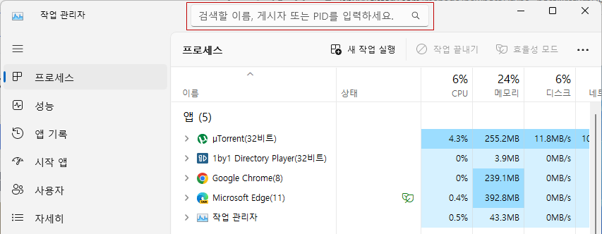 1) 작업관리자 상단에 [검색]창이 새로 생겼습니다... (검색할 일은 딱히 없을 것 같은데, 만들어두었네요.ㅎ)