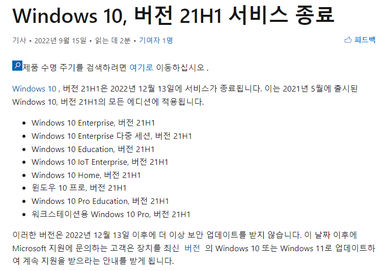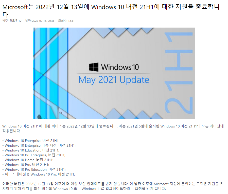 Windows 10, 19043 빌드가 내일(12월 13일)부로 서비스 지원이 종료될 예정입니다.