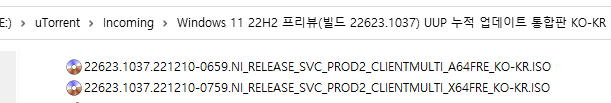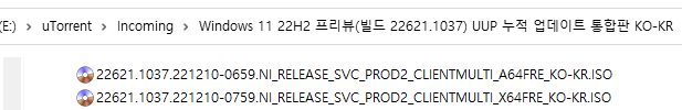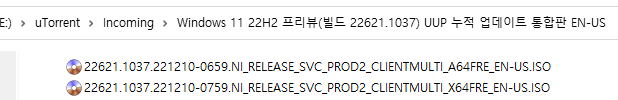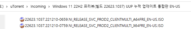 아래 파일은 UUP dump에서 배포하는 스크립트를 이용해서 MS에서 배포하는 파일(ESD, cab파일)로 만든 순수 ISO 파일입니다.