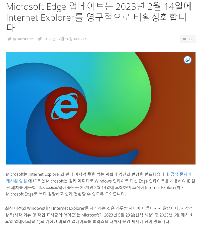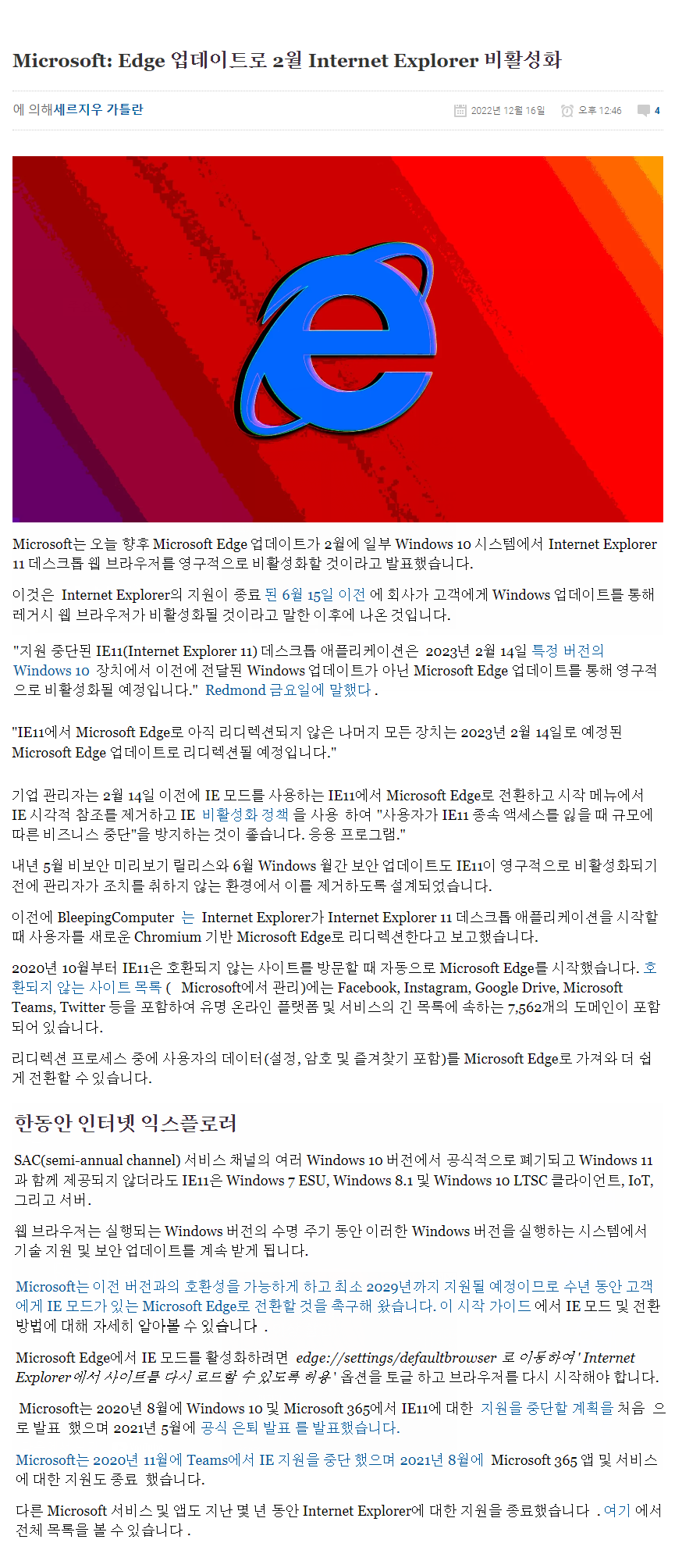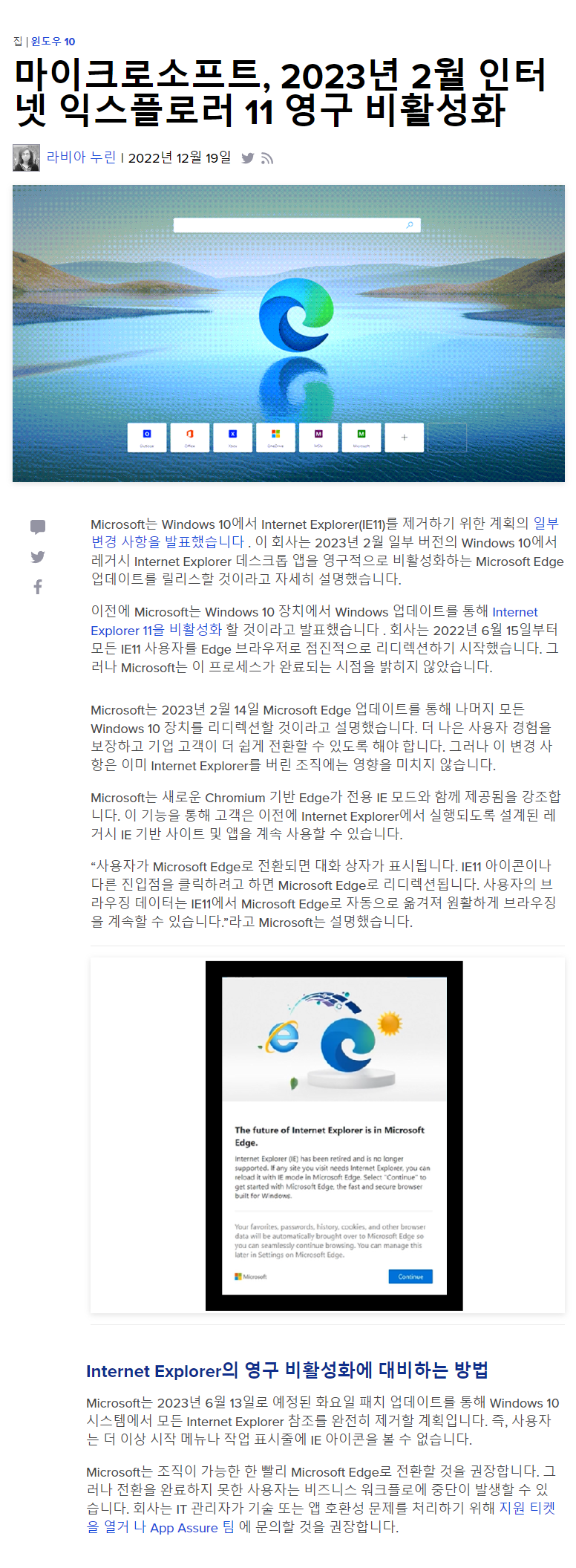 Microsoft Edge 2월 업데이트 이후에 IE 비활성화될 예정이라고 합니다.