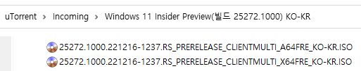 아래 파일은 UUP dump에서 배포하는 스크립트를 이용해서 MS에서 배포하는 파일(ESD, cab파일)로 만든 순수 ISO 파일입니다.