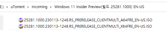 아래 파일은 UUP dump에서 배포하는 스크립트를 이용해서 MS에서 배포하는 파일(ESD, cab파일)로 만든 순수 ISO 파일입니다.