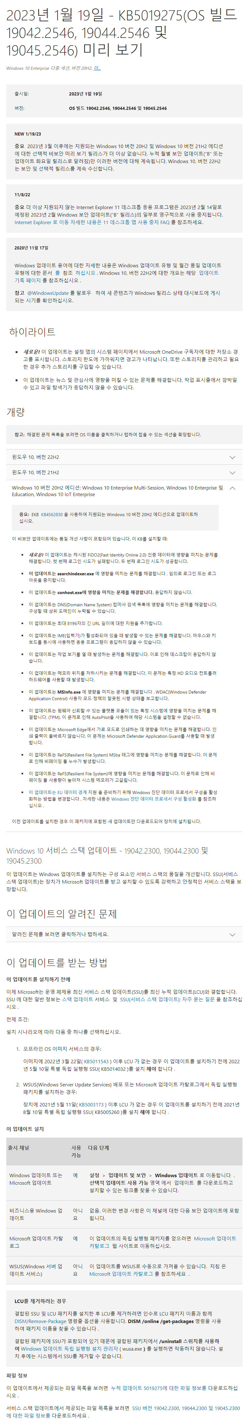 2023-01 Windows 10 Version 20H2 (2009)에 대한 누적 업데이트 (KB5019275) : 19042.x → 19042.2546
