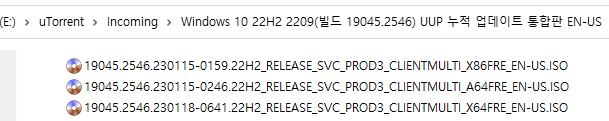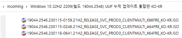 아래 파일은 UUP dump에서 만든 스크립트를 이용해서 MS에서 배포하는 파일(ESD, cab파일)로 만든 순수 ISO 파일입니다.