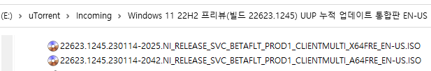 아래 파일은 UUP dump에서 배포하는 스크립트를 이용해서 MS에서 배포하는 파일(ESD, cab파일)로 만든 순수 ISO 파일입니다.