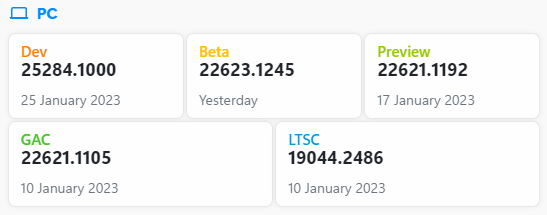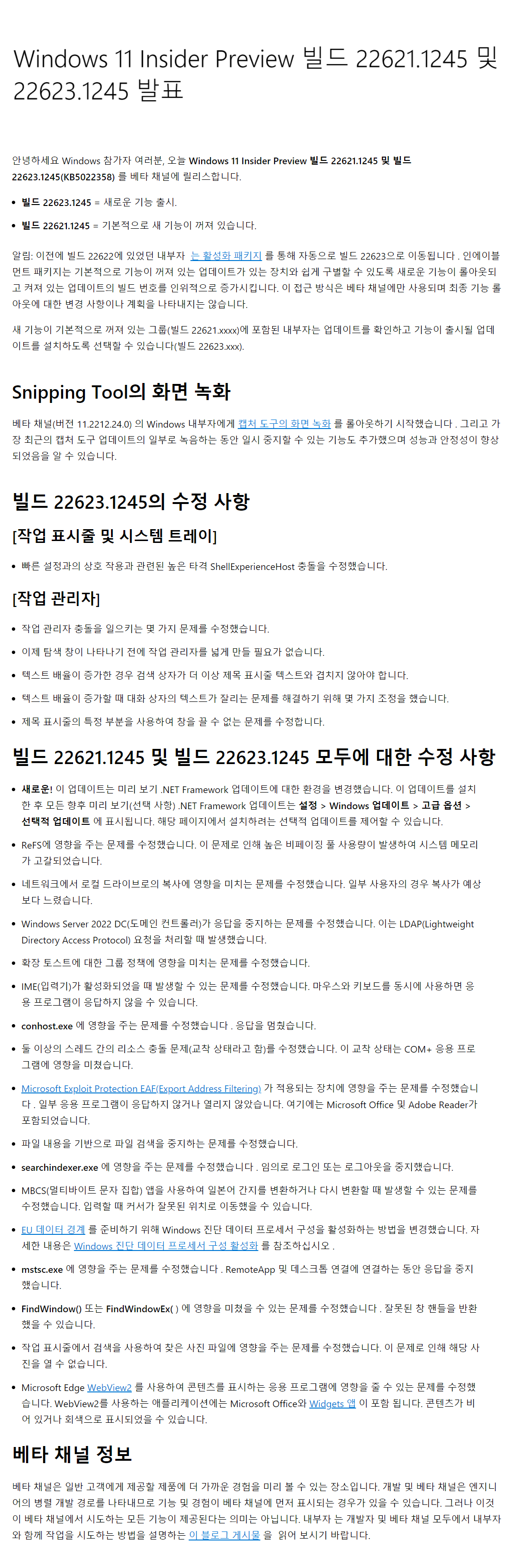 ○ 베타 채널 [Beta] = Windows 11 : 빌드 22621.1245 / 22623.1245 (= 참가자 빌드)