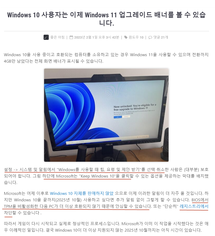 MS에서 Windows 10 사용자에게 아래 그림처럼 Windows 11로 업그레이드를 유도하는 광고를 띄우고 있습니다.