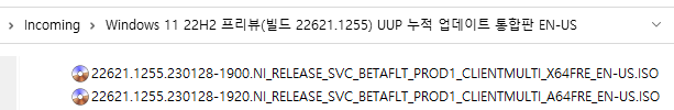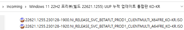 아래 파일은 UUP dump에서 배포하는 스크립트를 이용해서 MS에서 배포하는 파일(ESD, cab파일)로 만든 순수 ISO 파일입니다.