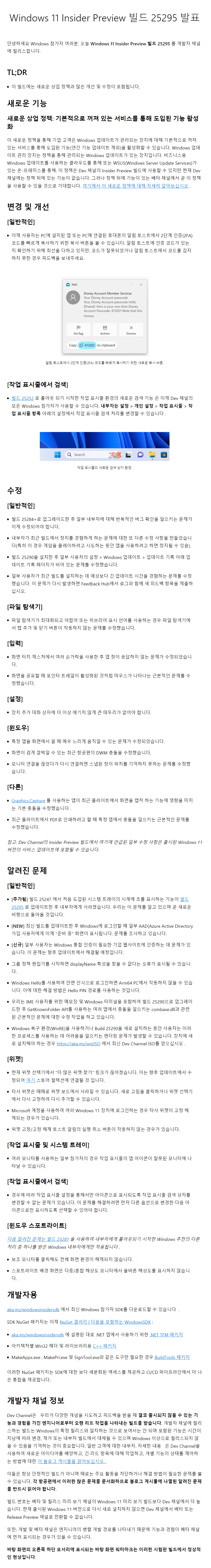 ○ 개발자 채널 [Dev] = Windows 11 : 빌드 25295.1000 (= 참가자 빌드)