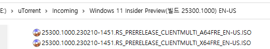 아래 파일은 UUP dump에서 배포하는 스크립트를 이용해서 MS에서 배포하는 파일(ESD, cab파일)로 만든 순수 ISO 파일입니다.