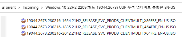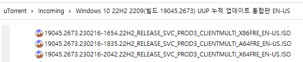 아래 파일은 UUP dump에서 만든 스크립트를 이용해서 MS에서 배포하는 파일(ESD, cab파일)로 만든 순수 ISO 파일입니다.
