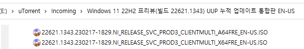 아래 파일은 UUP dump에서 배포하는 스크립트를 이용해서 MS에서 배포하는 파일(ESD, cab파일)로 만든 순수 ISO 파일입니다.