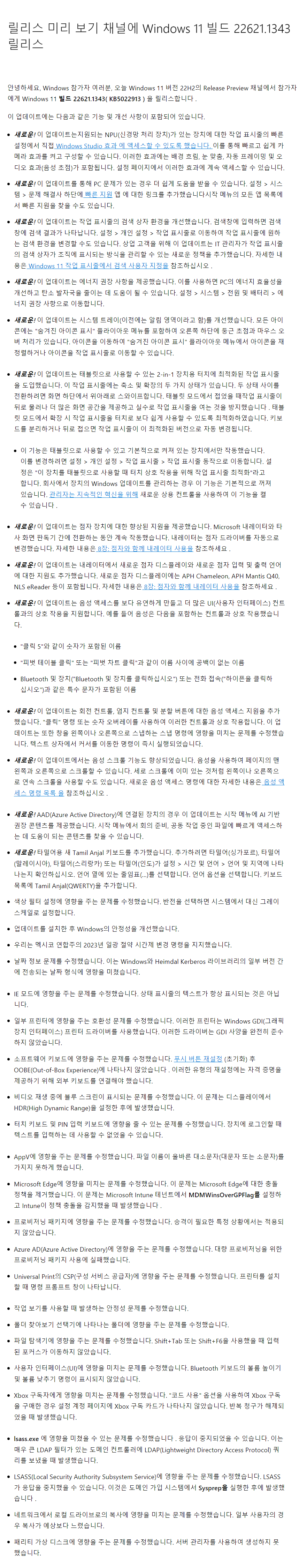 ○ 미리보기 채널 [Release Preview] = Windows 11 : 빌드 22621.1343 (= 참가자 빌드)