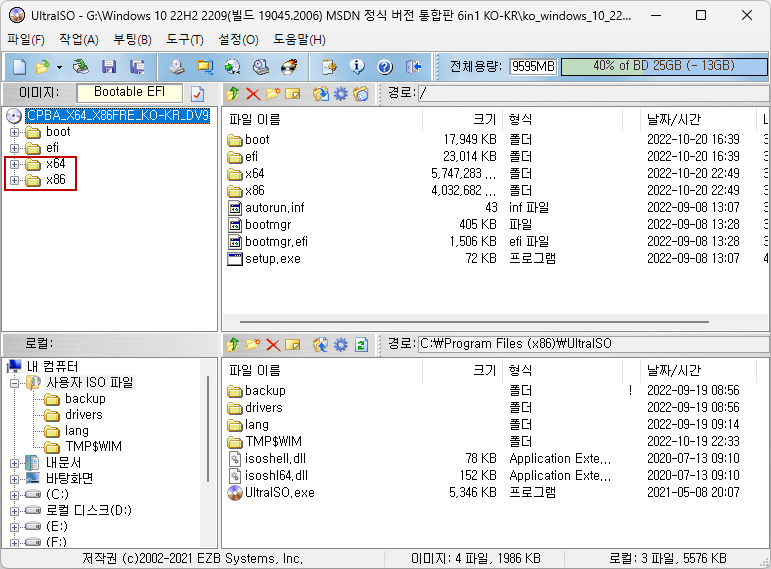 아래 처럼 x64 / x86 버전이 같이 들어 있는 ISO 파일을 구울 경우 사용합니다.