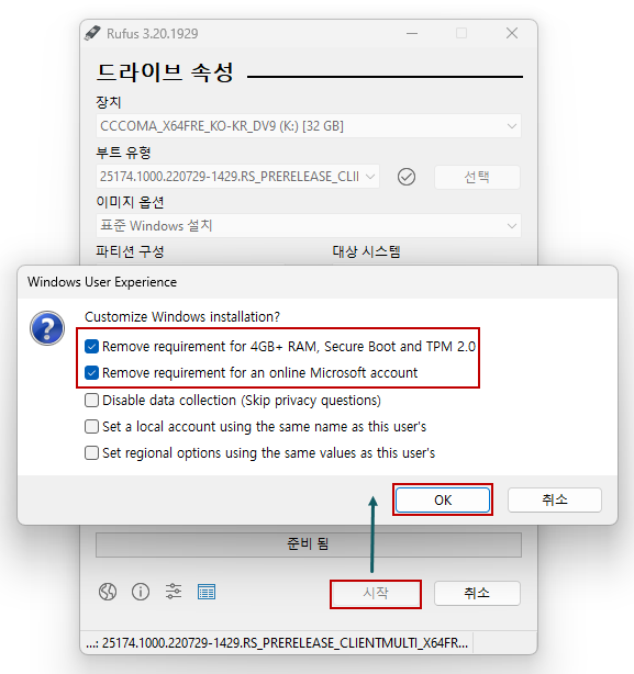 아래 그림은 Windows 11을 구울 때 뜨는 대화상자입니다.
