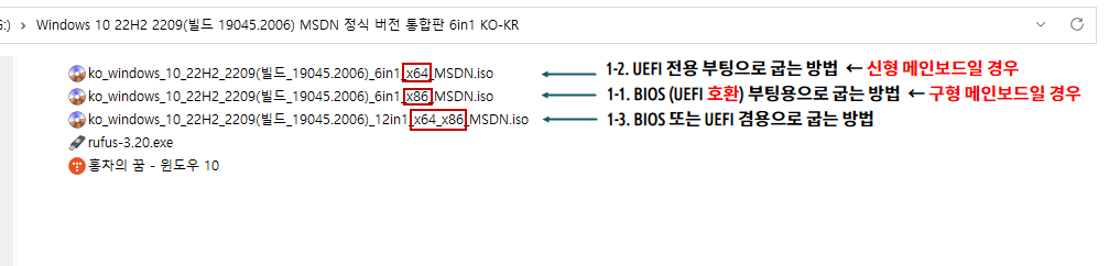 아래 처럼 ISO 파일이 있을 경우 각각 그에 맞는 방식으로 USB에 구워줍니다.