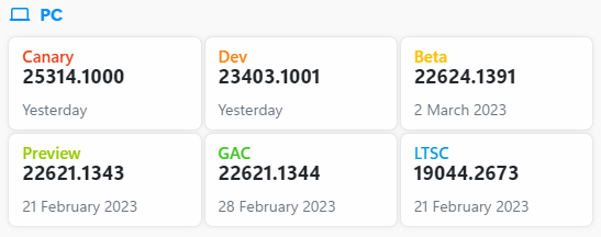 Canary 채널 : 개발 주기 초기에 최신 플랫폼 변경 사항을 미리 테스트. 고객에게 출시되기 전에 더 긴 리드 타임이 필요한 플랫폼 변경 사항을 미리 볼 수 있음. 변경 사항 중 일부는 제공되지 않으며 나머지는 준비가 되면 향후 Windows 릴리스에 표시