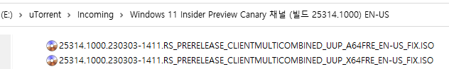 아래 파일은 UUP dump에서 배포하는 스크립트를 이용해서 MS에서 배포하는 파일(ESD, cab파일)로 만든 순수 ISO 파일입니다.