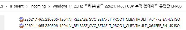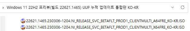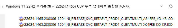 아래 파일은 UUP dump에서 배포하는 스크립트를 이용해서 MS에서 배포하는 파일(ESD, cab파일)로 만든 순수 ISO 파일입니다.