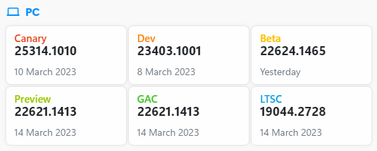 - Canary 채널 : 개발 주기 초기에 최신 플랫폼 변경 사항을 미리 테스트. 고객에게 출시되기 전에 더 긴 리드 타임이 필요한 플랫폼 변경 사항을 미리 볼 수 있음. 변경 사항 중 일부는 제공되지 않으며 나머지는 준비가 되면 향후 Windows 릴리스에 표시
