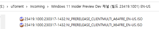 아래 파일은 UUP dump에서 배포하는 스크립트를 이용해서 MS에서 배포하는 파일(ESD, cab파일)로 만든 순수 ISO 파일입니다.
