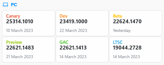 Canary 채널 : 개발 주기 초기에 최신 플랫폼 변경 사항을 미리 테스트. 고객에게 출시되기 전에 더 긴 리드 타임이 필요한 플랫폼 변경 사항을 미리 볼 수 있음. 변경 사항 중 일부는 제공되지 않으며 나머지는 준비가 되면 향후 Windows 릴리스에 표시
