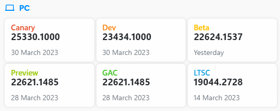 - Canary 채널 : 개발 주기 초기에 최신 플랫폼 변경 사항을 미리 테스트. 고객에게 출시되기 전에 더 긴 리드 타임이 필요한 플랫폼 변경 사항을 미리 볼 수 있음. 변경 사항 중 일부는 제공되지 않으며 나머지는 준비가 되면 향후 Windows 릴리스에 표시