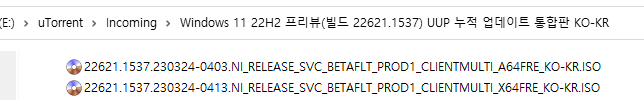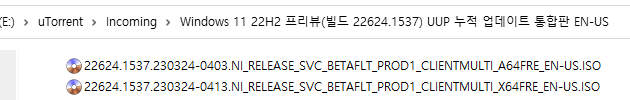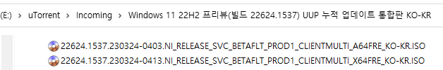 아래 파일은 UUP dump에서 배포하는 스크립트를 이용해서 MS에서 배포하는 파일(ESD, cab파일)로 만든 순수 ISO 파일입니다.