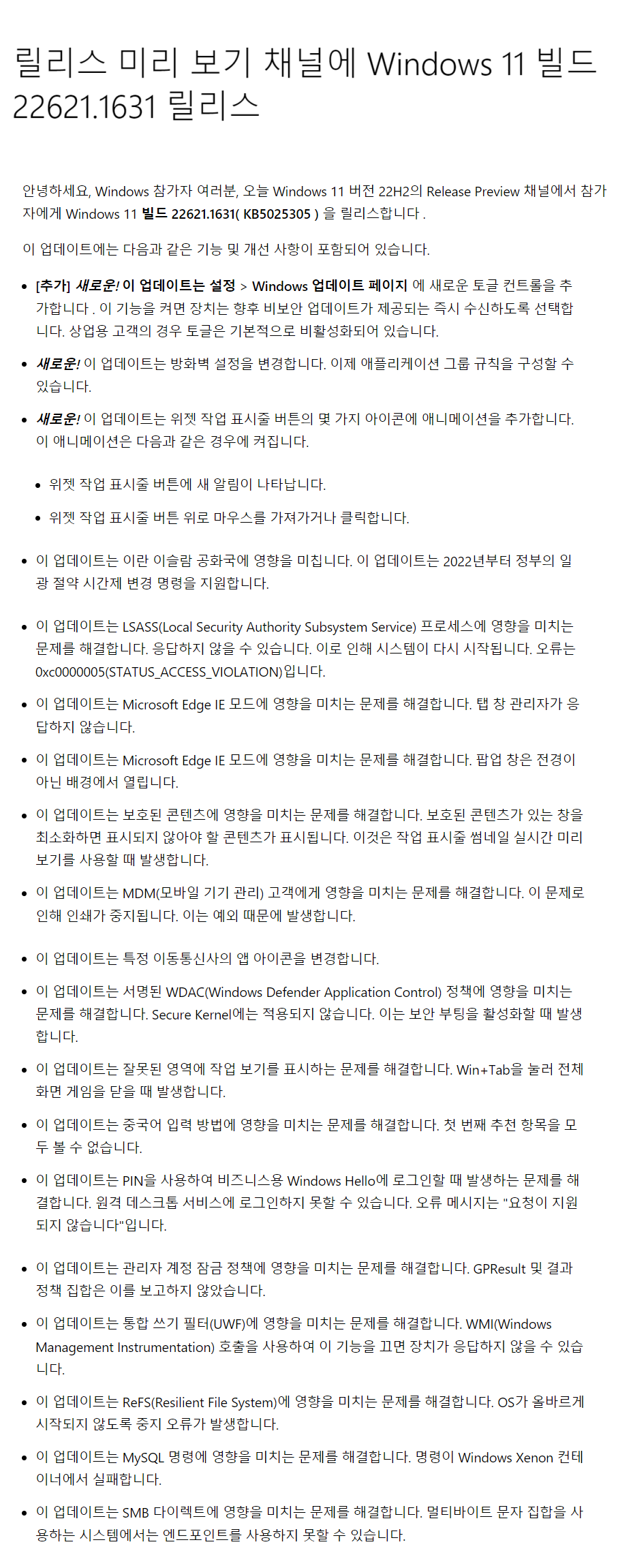 ○ 미리보기 채널 [Release Preview] = Windows 11 : 빌드 22621.1631 (= 참가자 빌드)