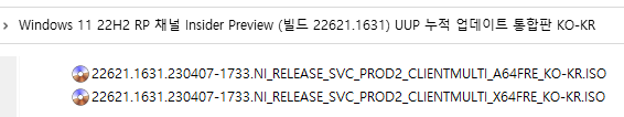 아래 파일은 UUP dump에서 배포하는 스크립트를 이용해서 MS에서 배포하는 파일(ESD, cab파일)로 만든 순수 ISO 파일입니다.