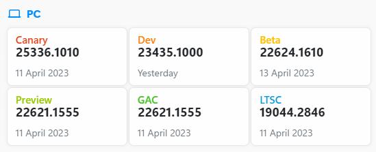 - Canary 채널 : 개발 주기 초기에 최신 플랫폼 변경 사항을 미리 테스트. 고객에게 출시되기 전에 더 긴 리드 타임이 필요한 플랫폼 변경 사항을 미리 볼 수 있음. 변경 사항 중 일부는 제공되지 않으며 나머지는 준비가 되면 향후 Windows 릴리스에 표시