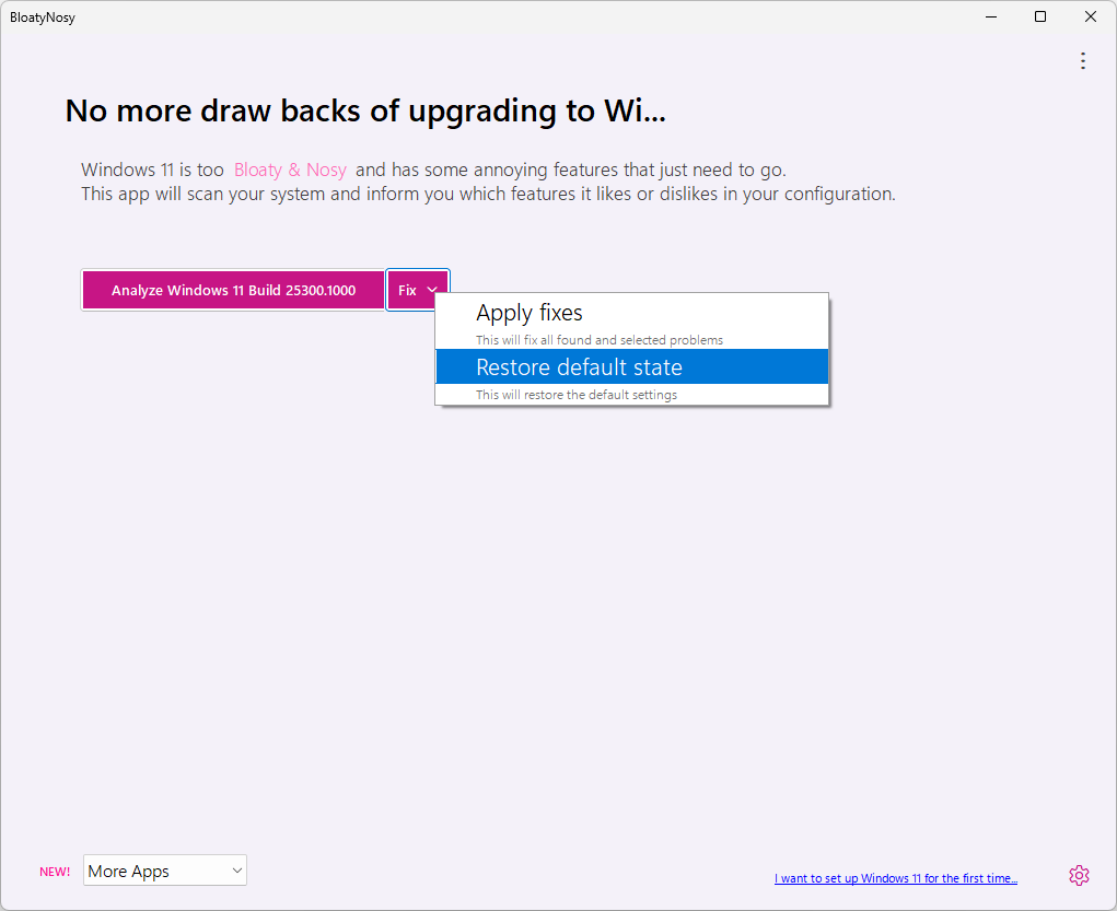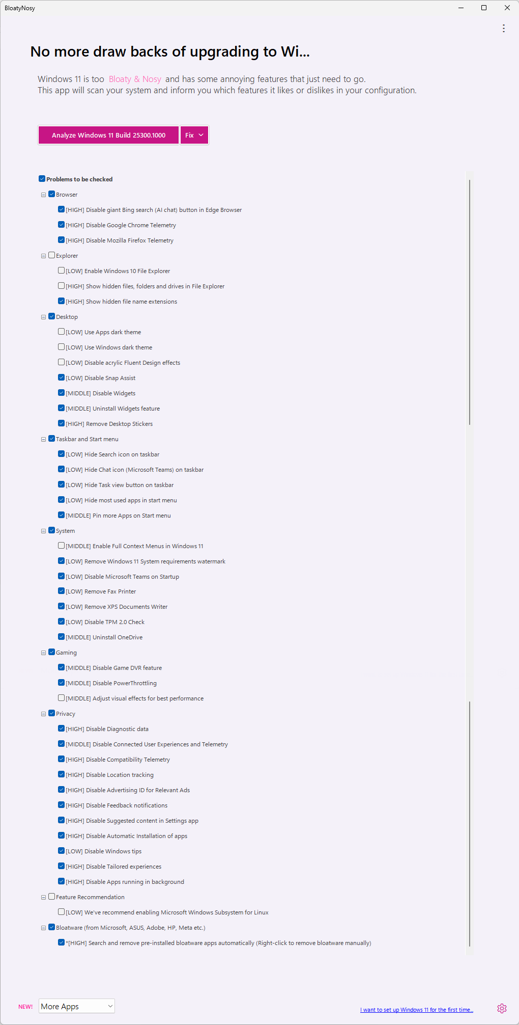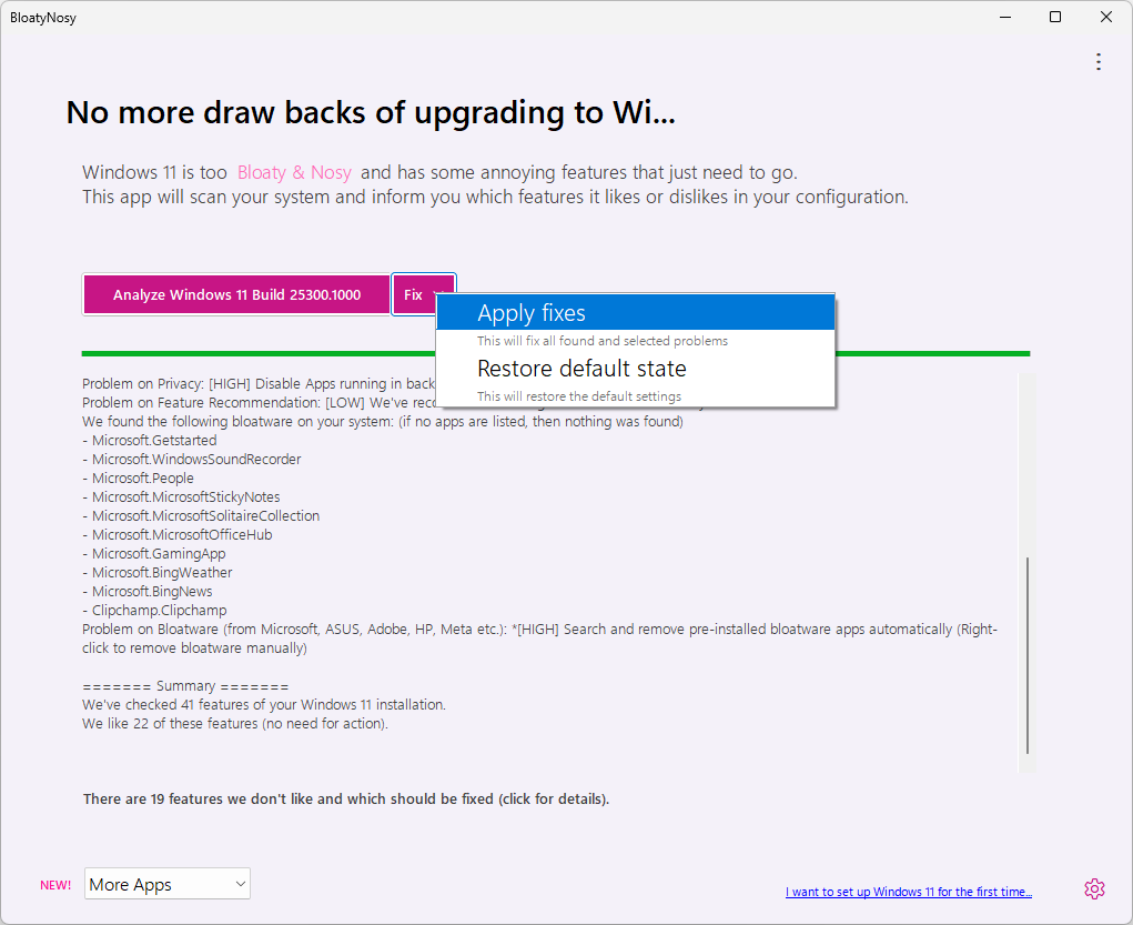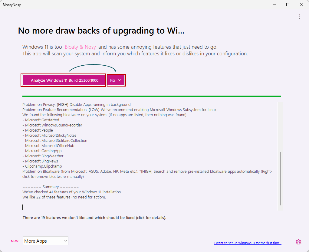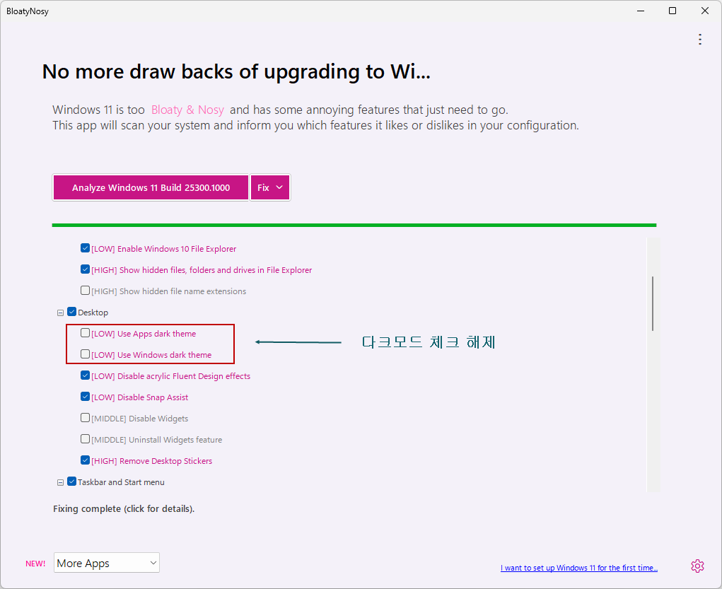 아래와 같이 [Analyze Windows 11 Build xxxxx] 버튼을 눌러주고 그 옆의 [Fix] 버튼을 눌러줍니다.