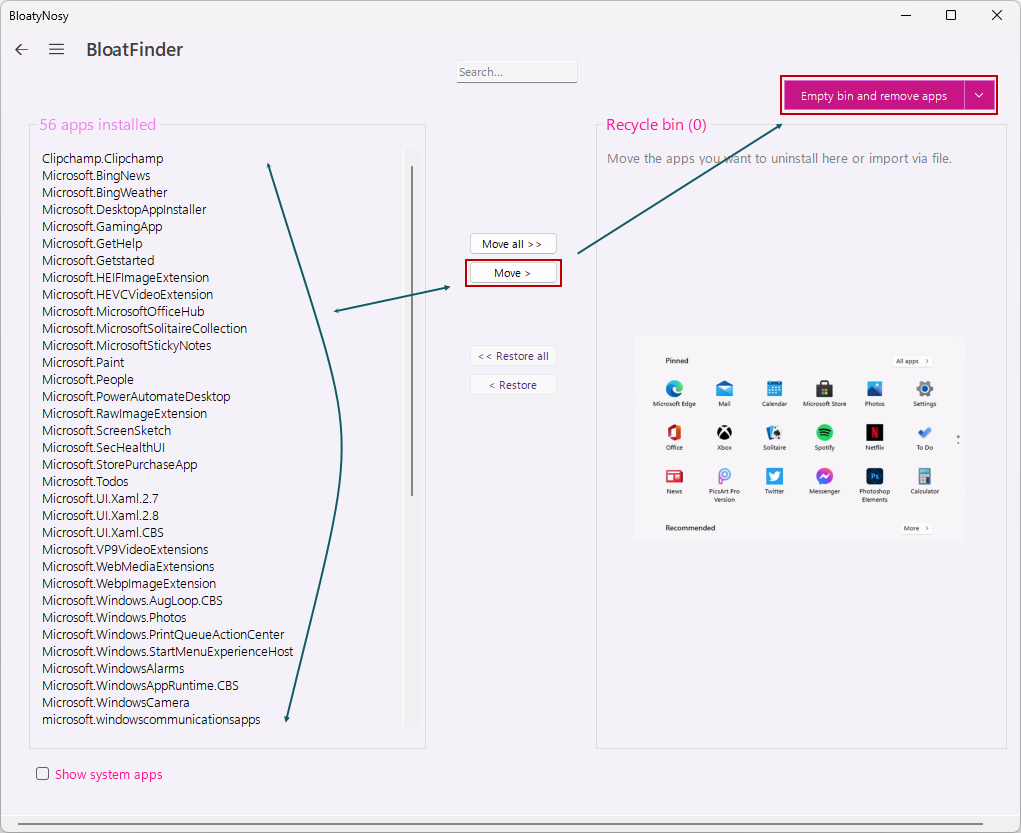 제거하고자 하는 앱을 선택후에 중간에 있는 [Move] 버튼을 누르면 오른쪽 창에 목록이 들어갑니다.