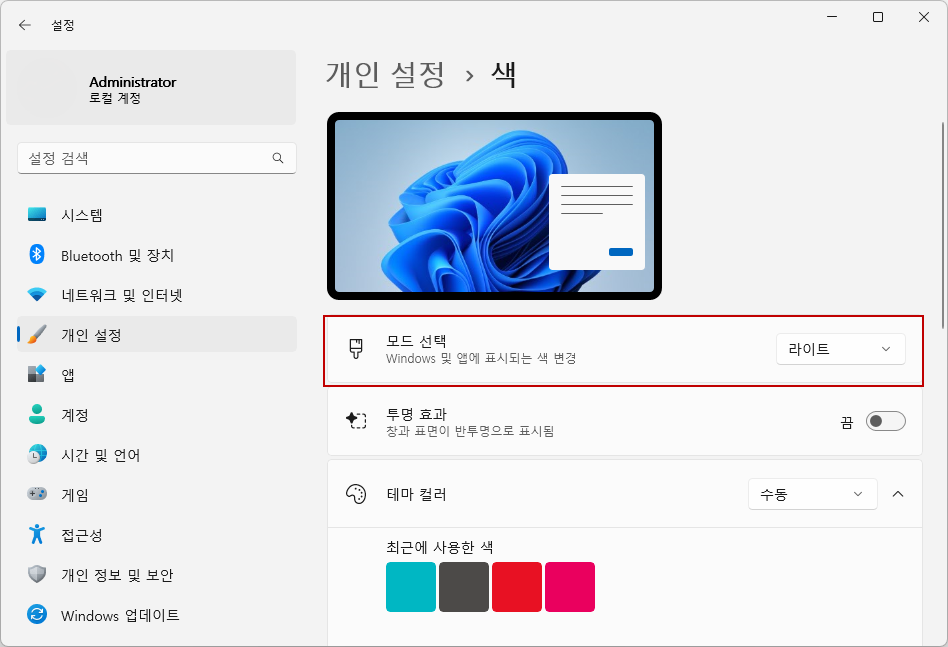 다크 모드를 체크해제해줍니다.... 안그럼 윈도우가 다크모드로 변경됩니다..ㅠ