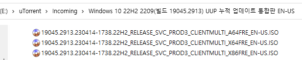 아래 파일은 UUP dump에서 만든 스크립트를 이용해서 MS에서 배포하는 파일(ESD, cab파일)로 만든 순수 ISO 파일입니다.