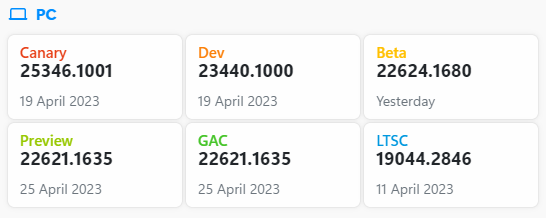 - Canary 채널 : 개발 주기 초기에 최신 플랫폼 변경 사항을 미리 테스트. 고객에게 출시되기 전에 더 긴 리드 타임이 필요한 플랫폼 변경 사항을 미리 볼 수 있음. 변경 사항 중 일부는 제공되지 않으며 나머지는 준비가 되면 향후 Windows 릴리스에 표시