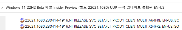 아래 파일은 UUP dump에서 배포하는 스크립트를 이용해서 MS에서 배포하는 파일(ESD, cab파일)로 만든 순수 ISO 파일입니다.