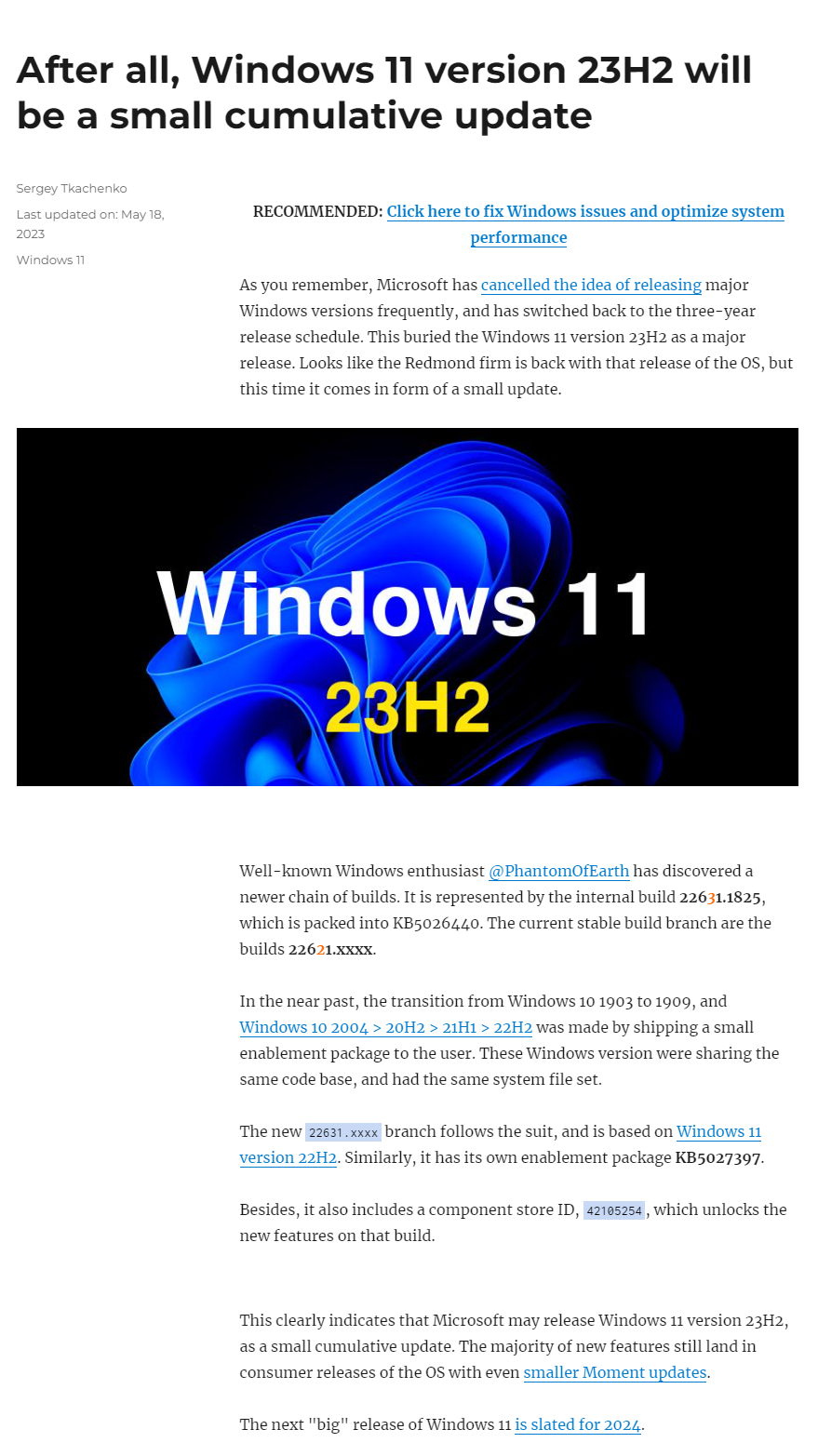 이는 Microsoft가 Windows 11 버전 23H2를 작은 누적 업데이트로 릴리스할 수 있음을 분명히 나타냅니다.