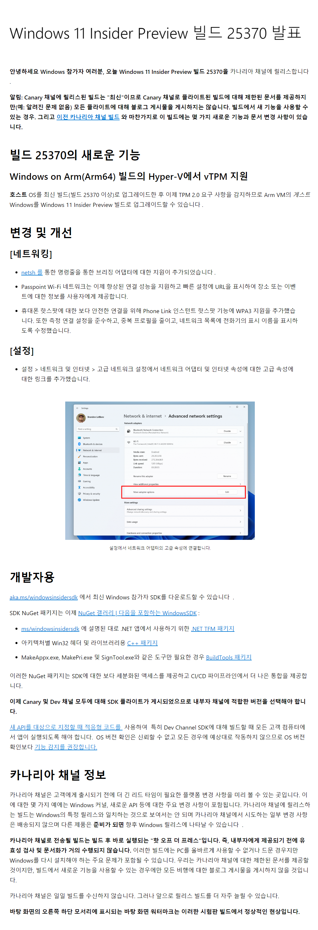 새 빌드 25370은 Windows on Arm의 Hyper-V에서 가상 TPM(vTPM)에 대한 지원을 추가합니다.